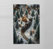 Treno in miniatura in un paesaggio innevato con alberi e luci pellicola backlit