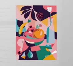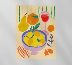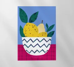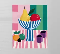 Una natura morta semplice e classica con una ciotola a righe con una mela, una pera e dell'uva, su uno sfondo rosa.