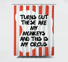 Stampa umoristica con lo slogan "A quanto pare queste sono le mie scimmie e questo è il mio circo" - testo nero su sfondo a righe bianche e rosse. Perfetto come regalo divertente, decorazione murale per l'ufficio o la casa. Ideale per gli appassionati di sarcasmo e caos.