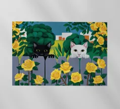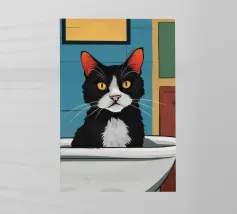 Un'affascinante raffigurazione di un gatto bianco e nero, probabilmente un gatto Tuxedo, seduto serenamente su un muro o un gradino di pietra danneggiato dalle intemperie. Il morbido fogliame verde e i delicati fiori rossi fanno da sfondo alla natura.