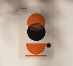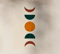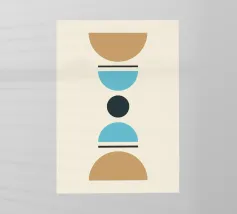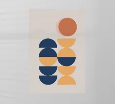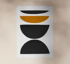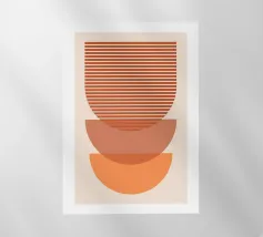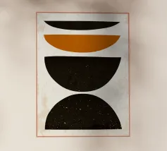 Due serie di semicerchi sono impilati verticalmente, ciascuno con colori contrastanti come l'arancione, il beige e il nero, creando motivi geometrici. La simmetria e il contrasto cromatico evocano un senso di equilibrio e di design moderno.