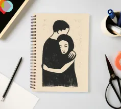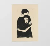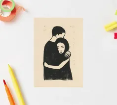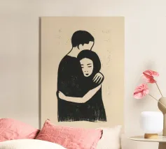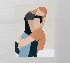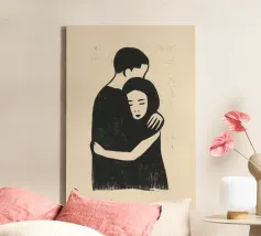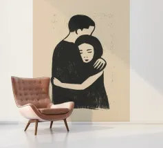 Due sagome si abbracciano in stretta e silenziosa vicinanza. Minimalista in nero su sfondo chiaro, la composizione cattura l'affetto, la sicurezza e l'intimità emotiva. Le linee chiare sottolineano l'armonia e il calore del momento.