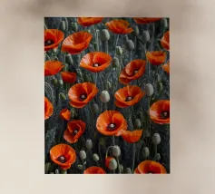 Questa opera d'arte mozzafiato, "Radiant Scarlett Poppy Symphony", cattura la bellezza eterea di tre papaveri incandescenti su uno sfondo nero e drammatico. Ogni papavero si dispiega con un calore incandescente, i suoi delicati petali sembrano illuminati dall'interno, mostrando uno spettro di ricchi rossi, arancioni infuocati e riflessi dorati. I dettagli intricati delle loro forme traslucide sono resi meticolosamente, sottolineando la loro natura fragile ma vibrante. I fiori completamente sbocciati sono accompagnati da graziosi steli ricoperti di pelliccia e da baccelli di papavero in boccio, che alludono al ciclo continuo della crescita e della crescita.