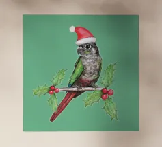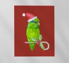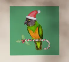 Illustrazione vettoriale digitale di un simpatico cacatua dalla cresta salmonata. Indossa un cappello natalizio e tiene in mano una caramella decorata con agrifoglio.