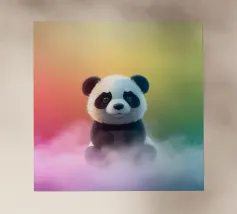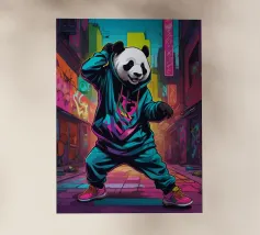 Un piccolo panda sta giocando in una pozzanghera, circondato da acqua piovana scintillante. Lo sfondo mostra luci colorate e una vibrante atmosfera cittadina in una giornata di pioggia.