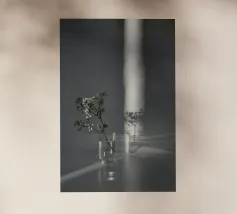 Un vaso di vetro trasparente contiene esili rami con piccoli boccioli, elegantemente esposti su un tavolo rotondo bianco. Gli interni tranquilli sono caratterizzati da luci soffuse e da un'estetica minimalista che favorisce la tranquillità.