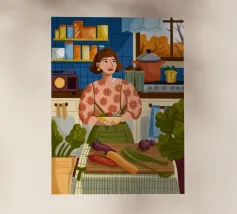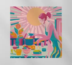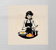 Una donna con il grembiule mescola gli ingredienti in una ciotola, irradiando calore e gioia in un'accogliente cucina, sottolineando la gioia dei pasti fatti in casa.