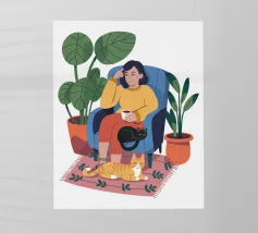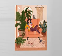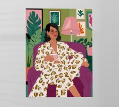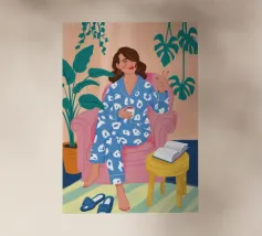 Questa opera d'arte mostra una persona seduta comodamente su una sedia, con indosso un pigiama blu e in mano una tazza di caffè. Lo sfondo è pieno di piante verdi e c'è un libro aperto su un tavolino, a sottolineare l'atmosfera rilassata e accogliente.