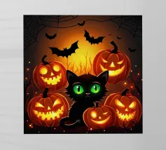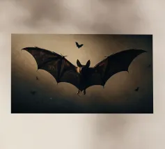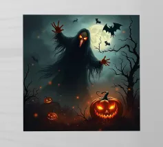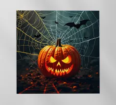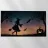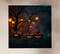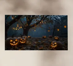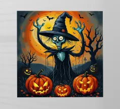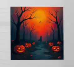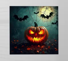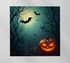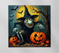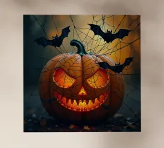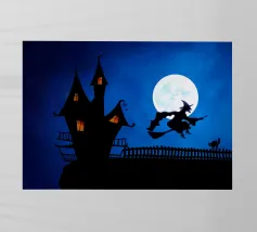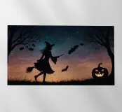 Al calare del crepuscolo, una strega in silhouette vola a cavallo della sua scopa tra i pipistrelli, con una zucca incandescente in primo piano, creando un'atmosfera incantevole.