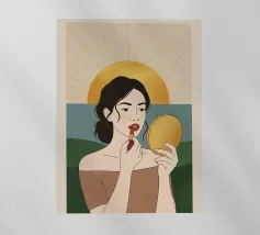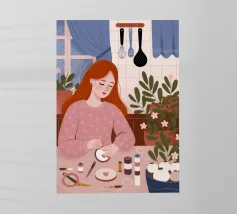 This artwork shows a person with blonde hair looking into a vanity mirror. The background is filled with floral wallpaper, and the vanity table is adorned with various items, creating a nostalgic and intimate scene.