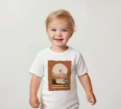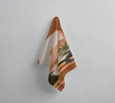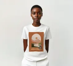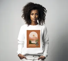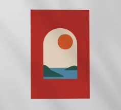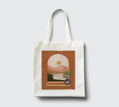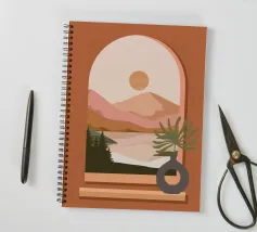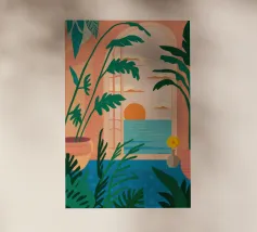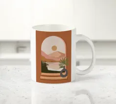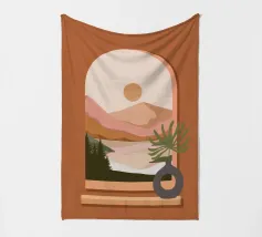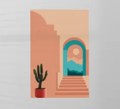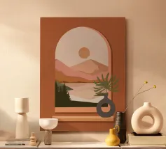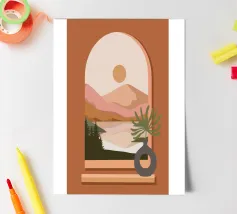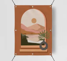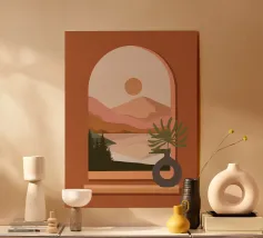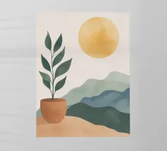 Una composizione minimalista presenta un vaso con una pianta verde davanti a una finestra ad arco, che mostra un paesaggio sereno con montagne, sole e lago in toni tenui. Le calde tonalità del marrone e del rosa creano un'atmosfera naturale e rilassante.