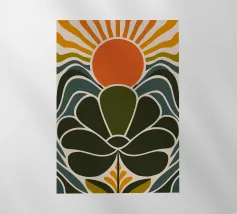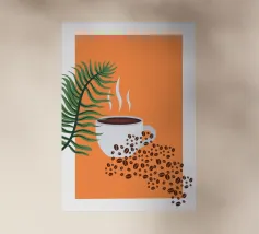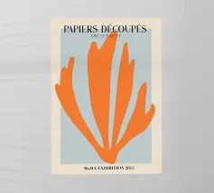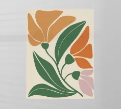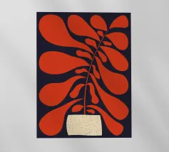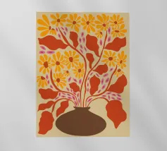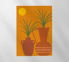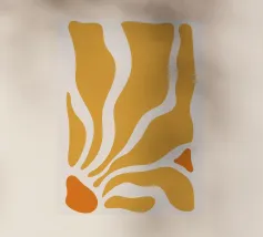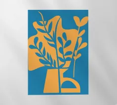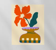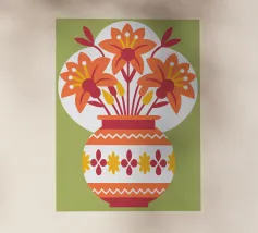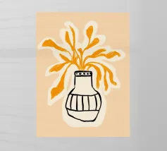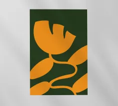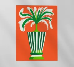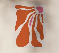 Un vaso stilizzato dalle forme astratte e fluide si estende verso l'esterno, ricordando forme vegetali. Il colore arancione vibrante contrasta con lo sfondo verde tenue, creando un effetto visivo dinamico.