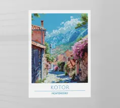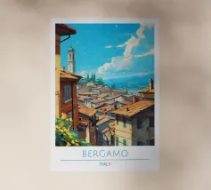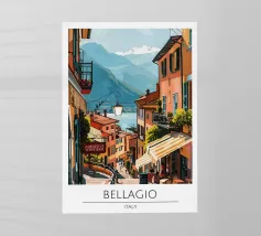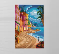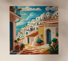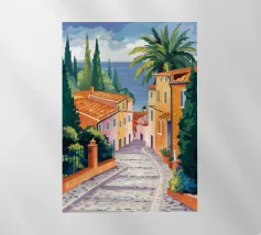 Una veduta prospettica di una strada europea stretta e tortuosa, fiancheggiata da edifici colorati, piante in vaso e diretta verso un cielo luminoso e nuvoloso.