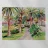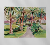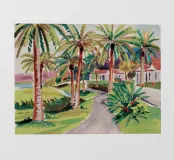 Una villa bianca e immacolata con il tetto di tegole rosse è incastonata tra palme maestose, un vialetto curvo conduce l'occhio in questo sereno e lussuoso ambiente tropicale o mediterraneo.