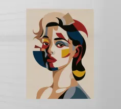 Un suggestivo ritratto astratto di un volto di donna, diviso in due metà, una nera e una bianca, con labbra rosse e capelli fluenti su un caldo sfondo arancione.