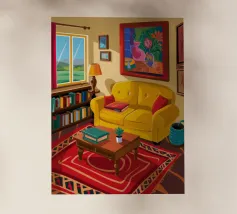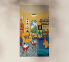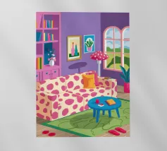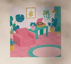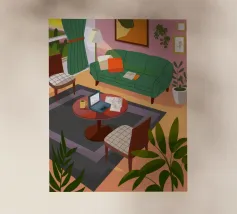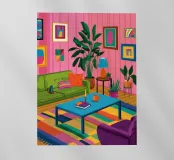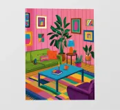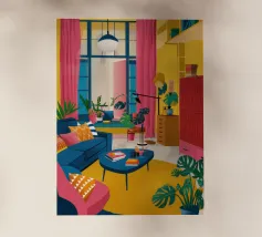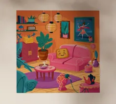 Un'illustrazione vivace di un soggiorno eclettico e massimalista con mobili colorati, una parete a galleria, numerose piante d'appartamento e un tappeto viola.