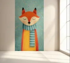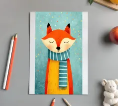 Una simpatica volpe rossa indossa una sciarpa a righe e sorride amichevolmente con gli occhi chiusi. L'illustrazione in stile libro per bambini combina un design piatto, colori pastello, un tema invernale ed effetti di coriandoli simili a puntini per creare un'atmosfera allegra e accogliente.