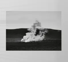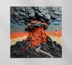 Un vulcano torreggiante si staglia contro il cielo, con le sue pendici scure striate da vecchie colate di lava. Densi pennacchi di fumo salgono dal cratere, si disperdono nell'aria e dipingono l'orizzonte con sfumature di grigio. L'atmosfera è tesa e viva, come se la terra stessa respirasse.