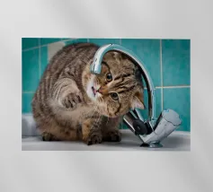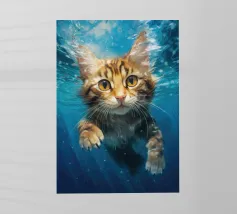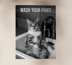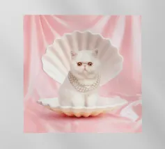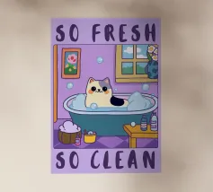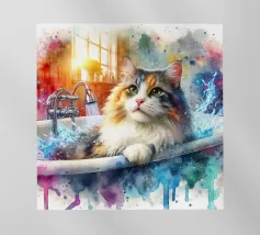 Un soffice gatto con gli occhi spalancati è seduto in una vasca da bagno piena di bolle, circondata da un bagno floreale azzurro e rosa. La scena offre un'espressione stravagante e leggermente sorpresa del gatto bagnato.