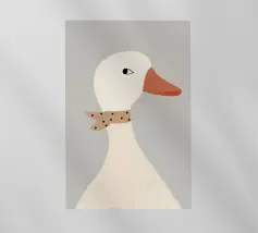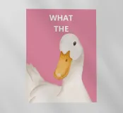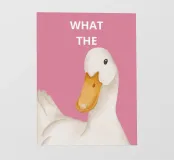 Un'anatra stravagante dall'espressione curiosa è centrata su uno sfondo rosa. Sopra l'anatra, un testo bianco in grassetto recita "WHAT THE".
