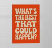 Design tipografico giocoso con la scritta "WHAT'S THE BEST THAT COULD HAPPEN?" in grandi lettere arrotondate color crema su sfondo arancione. Le lettere spesse e leggermente inclinate creano dinamismo, cordialità e una dichiarazione moderna e accattivante.