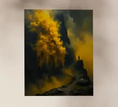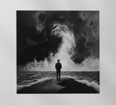 Questa illustrazione digitale in bianco e nero ritrae una ragazza in piedi ai margini di un paesaggio montano capovolto - un riflesso ossessionante del suo tumulto interiore e del suo isolamento. Circondata da cime frastagliate che emergono da un abisso, la ragazza cerca disperatamente di fare chiarezza, ma il mondo che la circonda rimane uno specchio di confusione. Il netto contrasto tra luce e buio, evidenziato dal mezzo digitale, amplifica il suo senso di disconnessione. Ogni passo è incerto, perché la donna affronta sia la vastità del paesaggio sia il caos silenzioso che lo circonda. Le montagne sono testimoni silenziosi del suo viaggio, dove