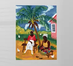 This painting depicts two individuals seated near a window, engaged in conversation. The green curtains and their patterned clothing add depth and texture to the scene.