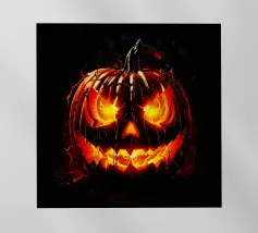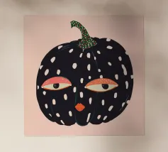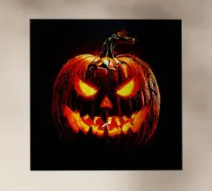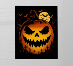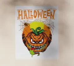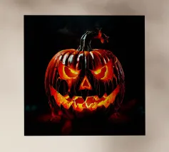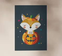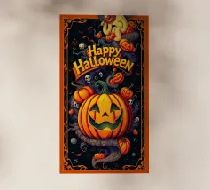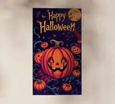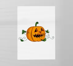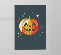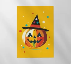 Un'allegra zucca di Halloween dai colori vivaci e dalle forme geometriche: moderna, giocosa e ideale per i temi autunnali di Halloween.