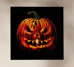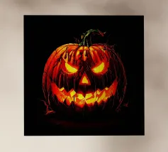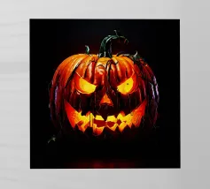 Zucca di Halloween geometrica e colorata con un viso allegro pellicola backlit