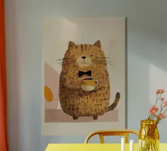 un gatto soriano vestito elegantemente che prende il suo tè (e se stesso) molto sul serio. Questo ritratto surreale bilancia l'eleganza con una strizzatina d'occhio all'assurdità: abito elegante, cravatta perfetta e la calma autorità di chi sa chiaramente più di voi. L'audace sfondo geometrico in ocra e blu conferisce al pezzo un tocco moderno e degno di una galleria, mentre il gatto stesso offre la giusta dose di fascino giocoso.