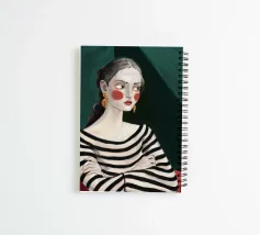 A portrait of a pensive woman with glasses and red lipstick, wearing a classic striped sweater. The painterly style and her thoughtful expression create an air of intellectual chic and introspection.