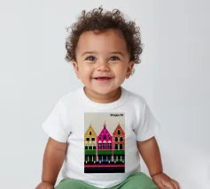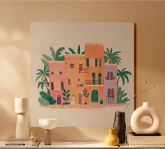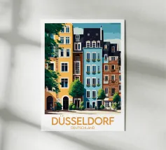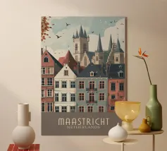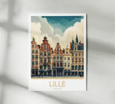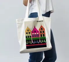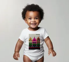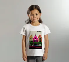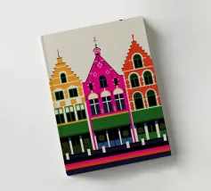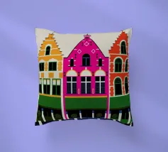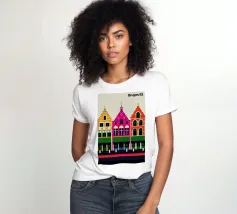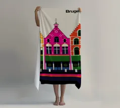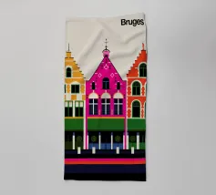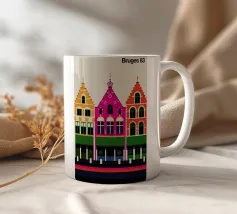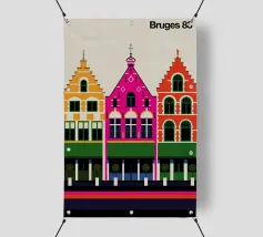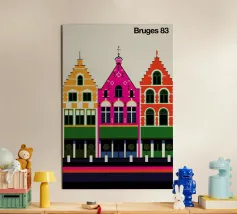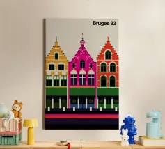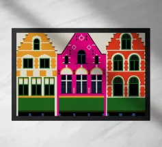 Questa immagine cattura l'architettura di Bruges con colori vivaci e precisione geometrica. Un'aggiunta perfetta a qualsiasi collezione di arte moderna. Ideale per gli amanti dei viaggi, dell'architettura e del design colorato.