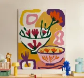 A bold and graphic abstract floral piece. Stylized flowers and leaves in a bowl are depicted with strong outlines and flat areas of color, creating a dynamic, modern, and highly decorative work of art.