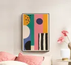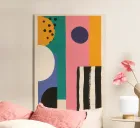 Abstract composition of geometric shapes in bold colours. Pink rectangle in the centre, surrounded by blue, yellow and white areas, circles and striped areas on a cream background. Dynamic, high-contrast and modern design.