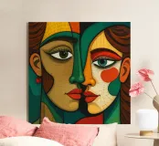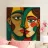 Dieses abstrakte Kubismus-Kunstwerk zeigt zwei ineinander verschmolzene Gesichter in lebhaften Farben. Perfekt als modernes Wandbild für Liebhaber expressionistischer Kunst.