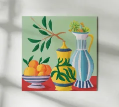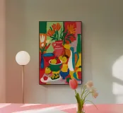 A modern, abstract still life of a table with a bowl of fruit and a vase of flowers. The deconstructed forms and bold, colorful shapes create a vibrant, energetic, and artistic composition.