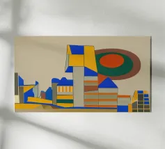 Opera d'arte geometrica astratta con colori vivaci e forme dinamiche