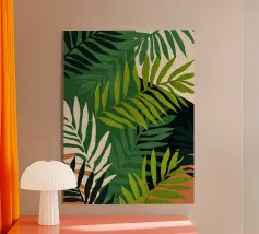 I motivi geometrici astratti a strisce verdi e gialle creano un senso di movimento nella composizione. Il disegno presenta elementi verticali di forma irregolare che suggeriscono un tema naturale.