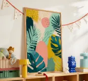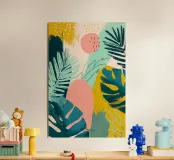 Una giocosa composizione astratta, ricca di audaci forme ispirate alla giungla e di pennellate vivaci. Questo disegno a mano combina verde acqua, blush, senape e menta in un layout gioioso e contemporaneo, perfetto per ravvivare gli interni moderni con un tocco tropicale.