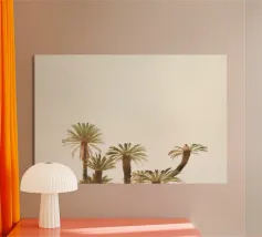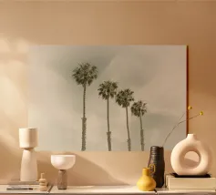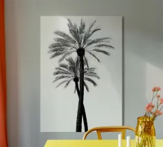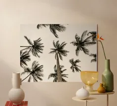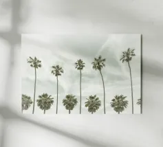Lasciatevi trasportare dall'eleganza e dalla maestosità di queste palme imponenti. Mentre le loro cime formano un disegno circolare contro un cielo morbido e pastello, sentite la pace e la calma che offre la natura. Questa angolazione insolita non solo mette in risalto l'altezza degli alberi, ma anche la loro bellezza senza tempo.