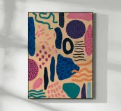 A playful abstract composition with various organic and geometric shapes and patterns in a palette of pink, blue, orange, and black, evoking a sense of joyful movement.
