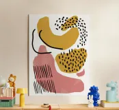 A dynamic abstract composition with flowing organic shapes in yellow, orange, and black, with splatter and dot patterns. The piece feels energetic and modern.