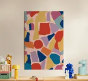 Un motivo astratto vivace e giocoso presenta forme colorate sparse come scaglie di terrazzo su uno sfondo neutro, creando un design festoso e moderno.