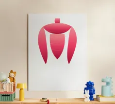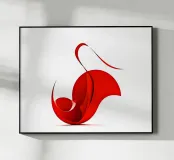This minimalist, abstract painting depicts a sculptural form that appears to consist of a single, bright red ribbon or cloth. The shape is elegantly curved and three-dimensional, with smooth, reflective surfaces that create volume and depth through light and shadow. The composition is reminiscent of a stylised flame, a dancing body or a musical symbol. The form is clearly isolated from the pure white background, which emphasises its dynamic and graceful movement and intense colour to the maximum. The work radiates modern elegance.