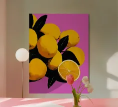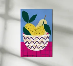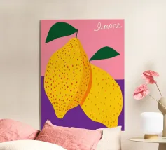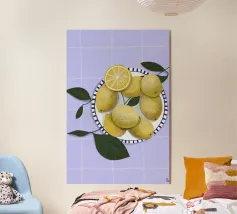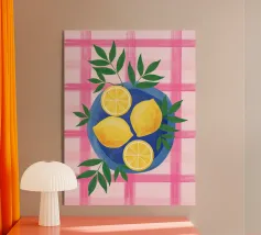 Una natura morta mediterranea con limoni e foglie verdi in tenui colori pastello è presentata in un motivo grafico a quadri. Questa illustrazione di ispirazione vintage dona un tocco di estate tropicale a qualsiasi cucina e celebra la freschezza di frutta e verdura biologica.