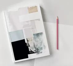 Collage astratto a tecnica mista di elementi di carta e pittura, moderno e nordico nella combinazione di colori, dall'eleganza minimalista.