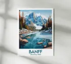 This poster features Banff National Park with its snow-capped peaks, crystal-clear lake and colourful forests. An ideal illustration for lovers of majestic landscapes and wild nature for your wall decoration.
