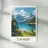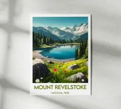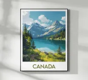 Uno spettacolare paesaggio canadese con un lago turchese circondato da montagne innevate e foreste maestose. Un'illustrazione grandiosa e naturale, perfetta per una decorazione murale ispirata ai grandi spazi aperti.