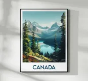 Una vista mozzafiato di un lago a forma di lupo circondato da montagne innevate e fitte foreste. Un'illustrazione iconica del Canada, perfetta per una decorazione murale ispirata alla natura selvaggia.