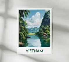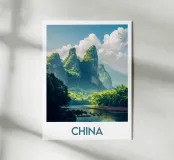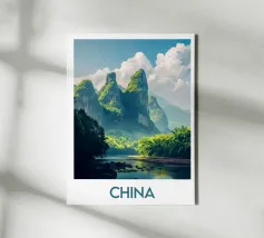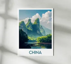 Maestose montagne carsiche si ergono sopra un fiume tranquillo, avvolto da una vegetazione lussureggiante. Un'illustrazione emblematica della Cina meridionale, ideale per un'atmosfera zen e naturale.